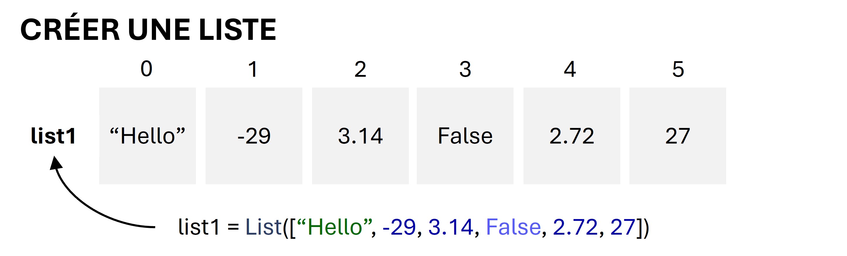 Une liste est une collection ordonnée d’éléments pouvant être de différents types, avec une longueur dynamique permettant à la liste de varier en taille après sa création. Vous pouvez ajouter ou supprimer des éléments sans avoir besoin de recréer la liste, contrairement aux tableaux.