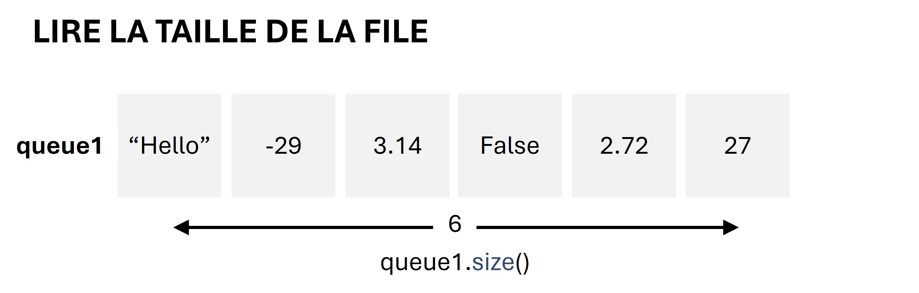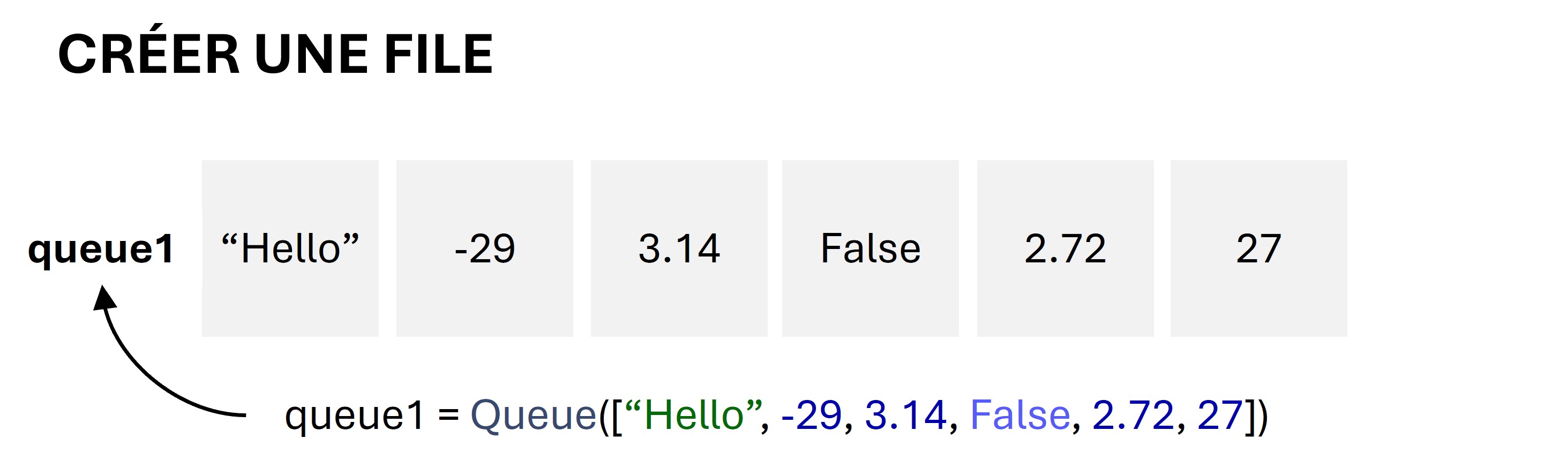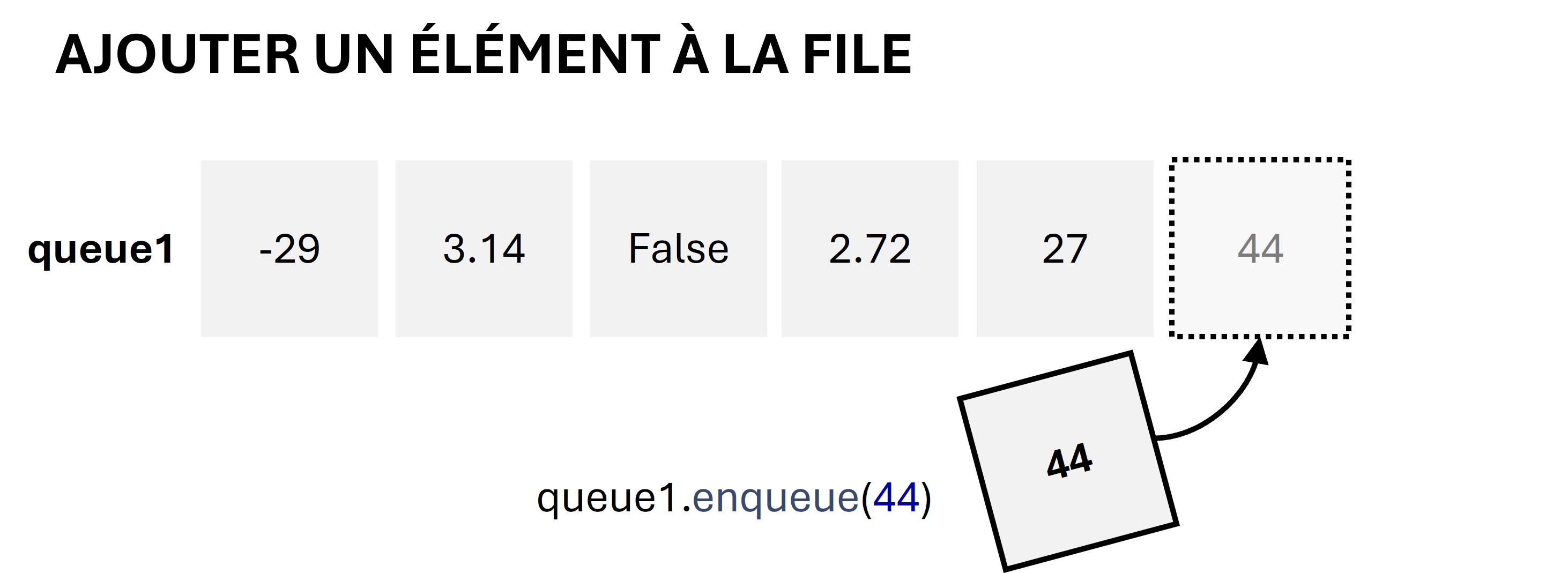 Une file (ou queue en anglais) est une liste qui suit le principe FIFO (First In, First Out), où le premier élément ajouté est le premier à être retiré.