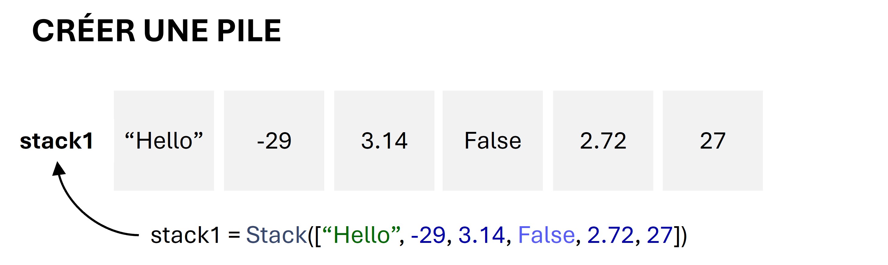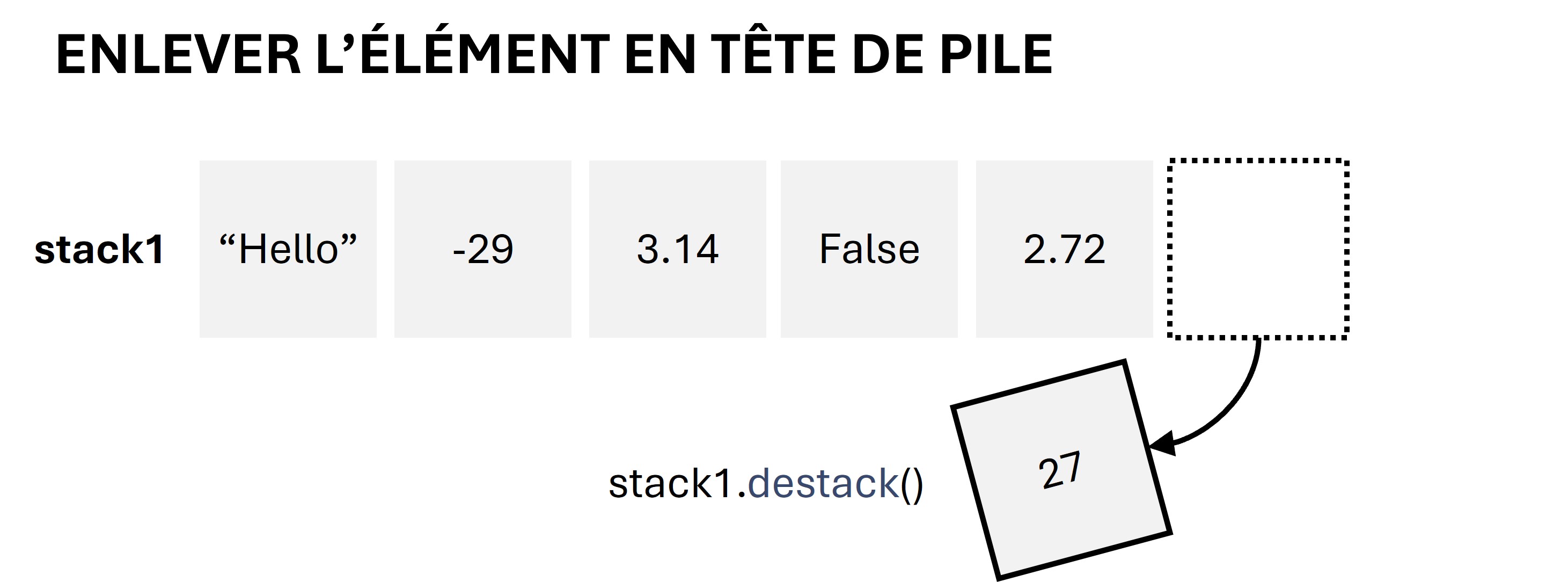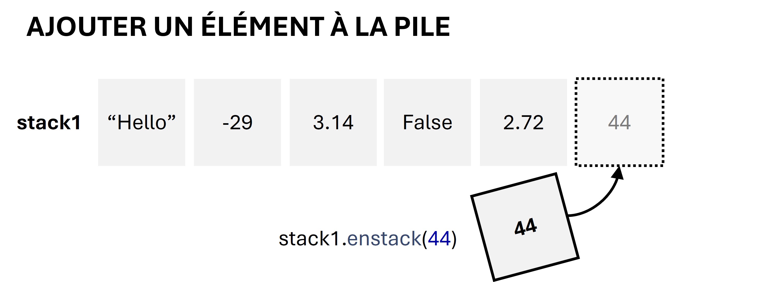 Une pile (ou stack en anglais) est une liste qui suit le principe LIFO (Last In, First Out), où le dernier élément ajouté est le premier à être retiré.