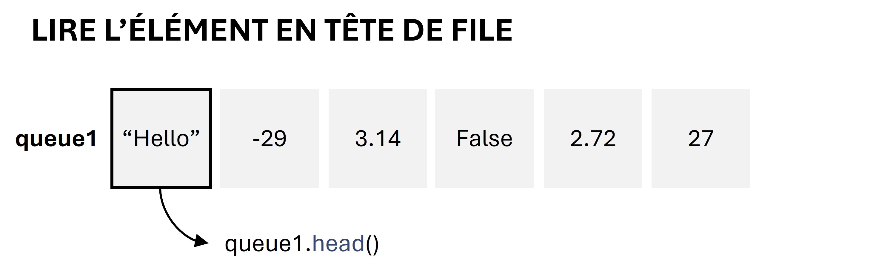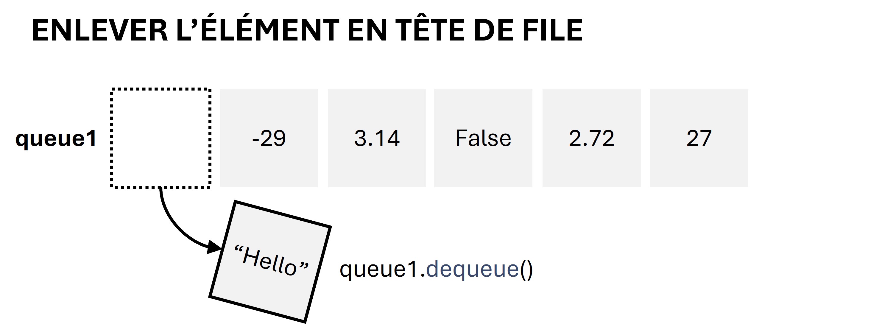 - Créer une variable \(item\) qui contient la tête de la file \(myQueue\)