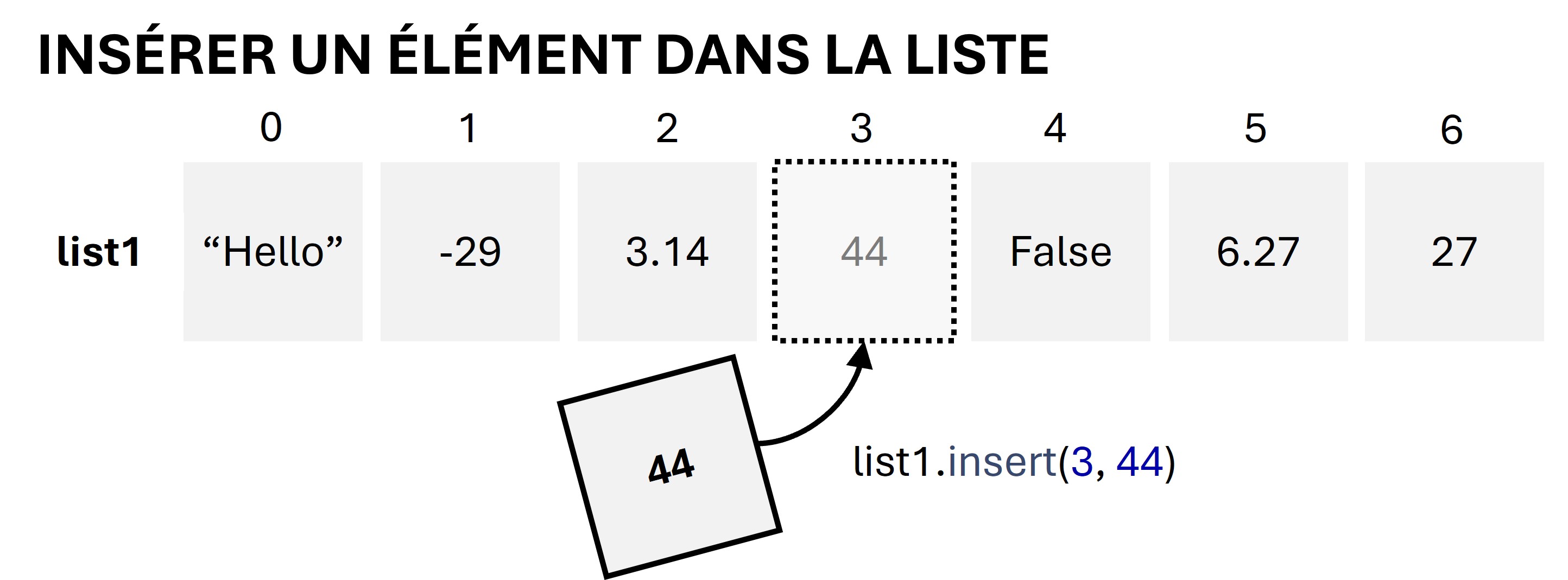 - Insérer sucessivement les valeurs \(False\), \(6.27\) et \(27\) à la fin de la liste \(myList\)